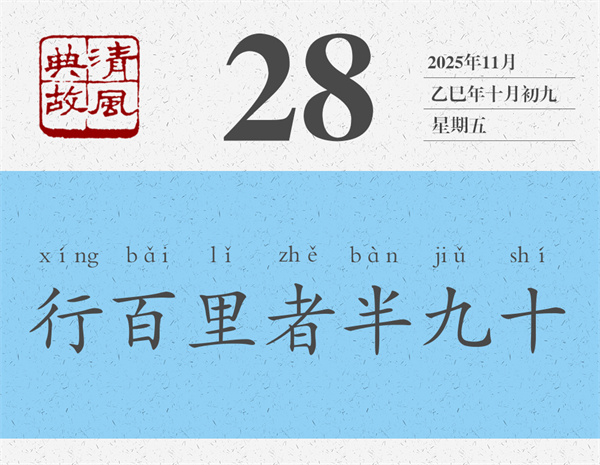 后人即以“行百里者半九十”為典,比喻做事情越到最后越困難,越接近成功越要認(rèn)真對待。黃庭堅雜言詩《贈元發(fā)弟放言》:“虧功一簣,未成丘山。鑿井九階,不次水澤。行百里者半九十,小狐汔(qì)濟(jì)濡其尾。故曰時乎,時不再來。終終始始,是謂君子。”全詩幾乎都在闡釋“行百里者半九十”。其中還用了《周易》中的一個比喻:小狐貍過河時,幾乎就要過去了,但因為拼命掙扎,還是弄濕了尾巴。