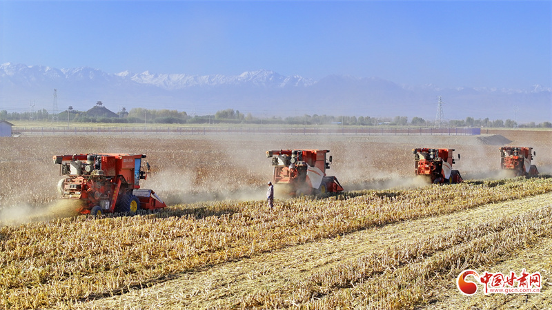 時下,在甘肅省張掖市民樂工業(yè)園區(qū)濱河集團萬畝原糧種植基地,農機手駕駛收割機穿梭田間地頭收割高粱,一派繁忙豐收景象。