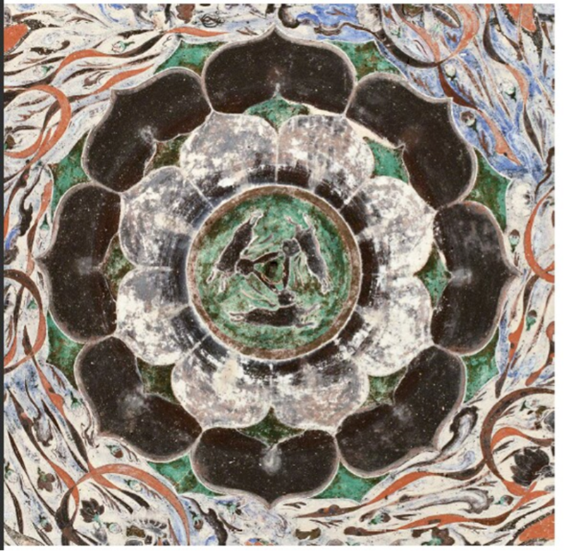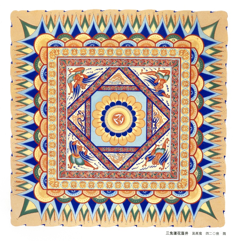 三兔共耳圖案、成熟的飛天造型、精美的紋飾圖案相互映襯,共同構成了這幅令人嘆為觀止的藻井壁畫,受到人們的廣泛關注和喜愛。