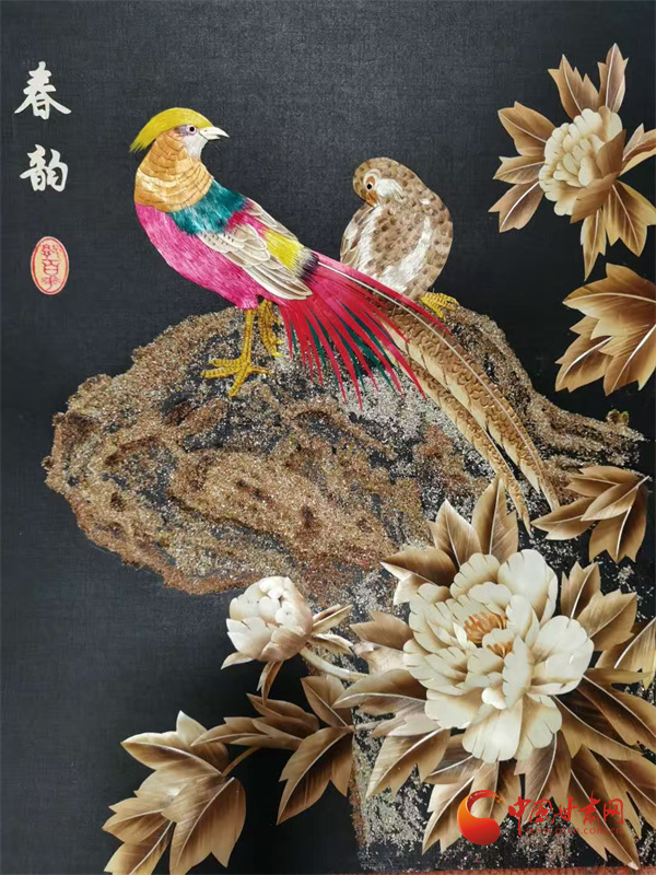 多年打磨后,郭百花走出了獨特的創(chuàng)作之路——以拼貼手法為主,讓作品更具層次感與立體感。在她十幾平米的“百花麥稈藝術工作室”里,《春韻》勾勒出江南詩意,《敦煌文旅》再現(xiàn)絲路風情,《孔雀戲牡丹》盡顯雍容華貴,而《錦上添花》中,小鳥的羽毛竟由細如發(fā)絲的麥稈剪貼而成,市場價達1500元左右。這些作品里,既有山川花鳥的靈動,更藏著通渭的鄉(xiāng)土記憶,平凡麥稈在她手中徹底“化腐朽為神奇”。