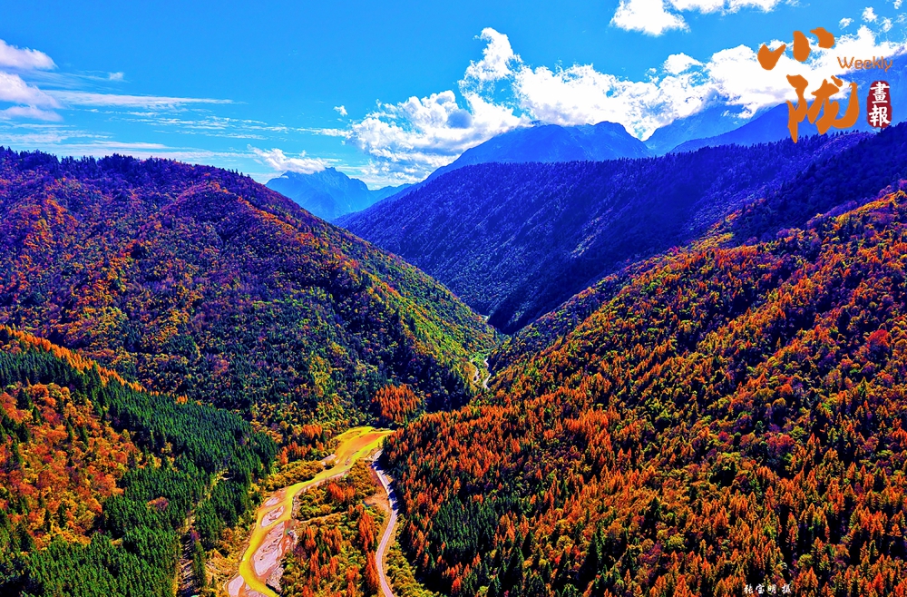 山巔的白雪與彩林形成鮮明對(duì)比,紅與黃,白與藍(lán),在陽(yáng)光的映照下,共同編織出一幅溫柔而夢(mèng)幻的畫卷。